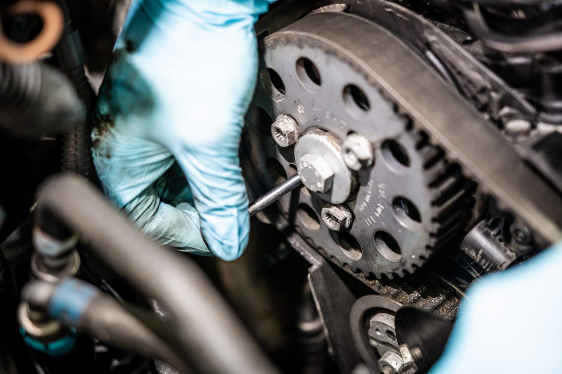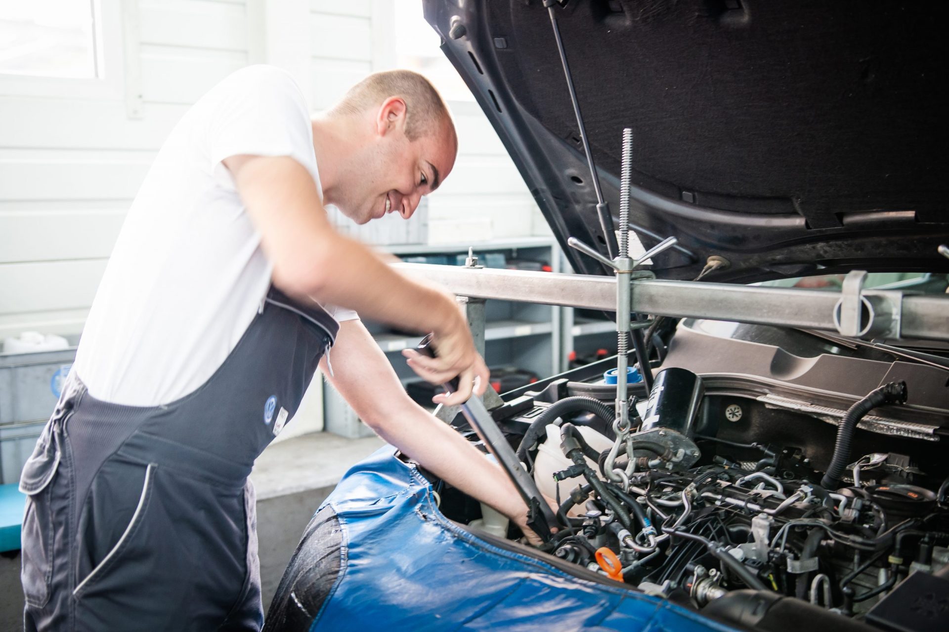 Eingekleidet in einer AMAG-Latzhose und ausgerüstet mit Stahlkappen-Sicherheitsschuhen geht es los. Unsere erste Aufgabe: Ein Zahnriemen will ersetzt werden. Obwohl der Patient – ein VW Passat – schon einige Jahre und Kilometer auf seinem Buckel hat, ist die Vorarbeit gross. Viele Teile müssen entfernt werden, damit wir den Zahnriemen entfernen können. Die Schrauben und Halterungen im Motorraum sitzen jeweils unterschiedlich fest, einige Halter sind dagegen trocken und brüchig.